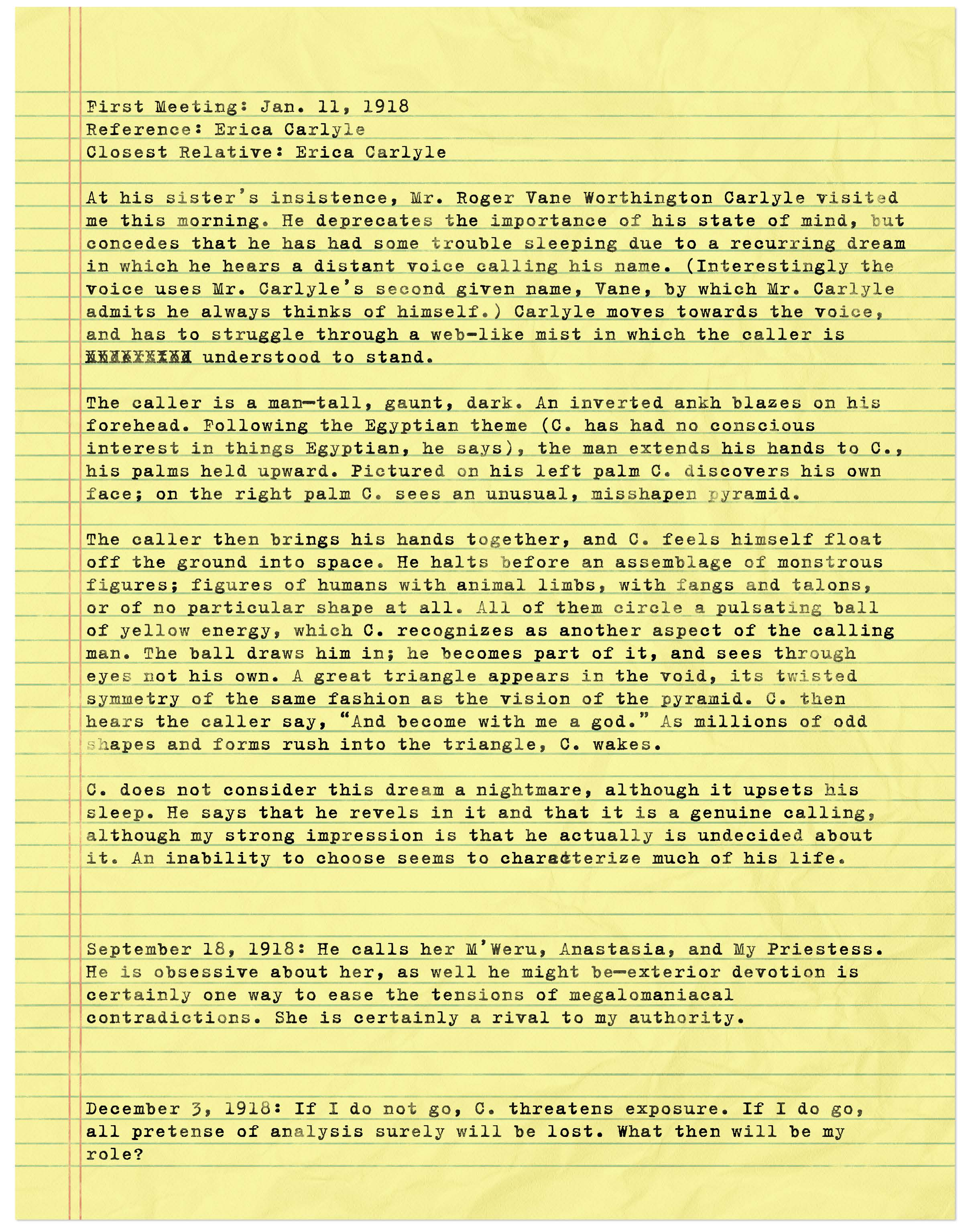 Не реагирует на записи пациентки Уоррен. Клементина читает ему стихи. Под рубашкой у него на груди татуировка. Выглядит как татуировка на Ларкине. Его врачом не был доктор Хьюстон, но его посещал доктор Хьюстон. В январе попал 1918, а летом к нему проходил Хьюстон. Как раз когда он попал в лечебницу. У него нашли эту книгу, и он вместе с ней попал в лечебницу. Записей не очень много. Если тодга лечащий врач. что Доктор хьюстон как специалист по юнгианскому психоанализу предложил посмотреть последнюю книгу этого пациента. А пациентки были и в 17 и в 18.