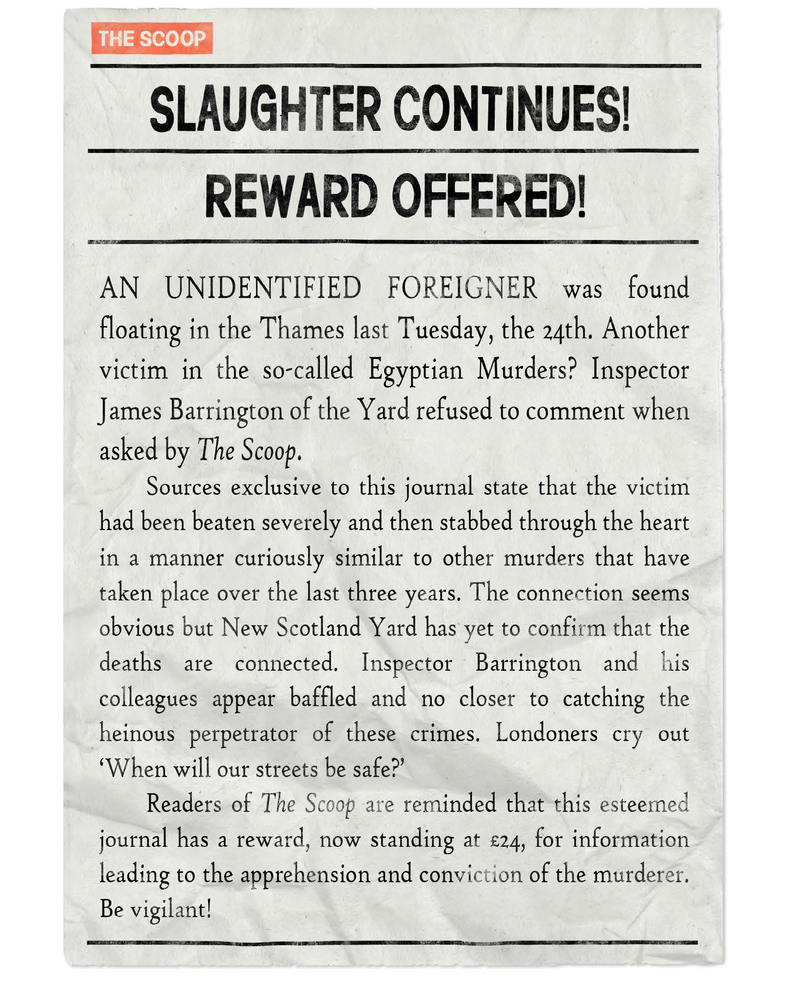 Роджеру звонок от издателя Кеникстон, говорит мол пришло письмо от Микки Махони издателя газеты зэ скуп. Он делал подборку статей и просил уточнить у Джексон Элиас темы конкретные, и он прислал пару статей и спрашивает достаточно может этого. И там вырезка про убийства египетские.