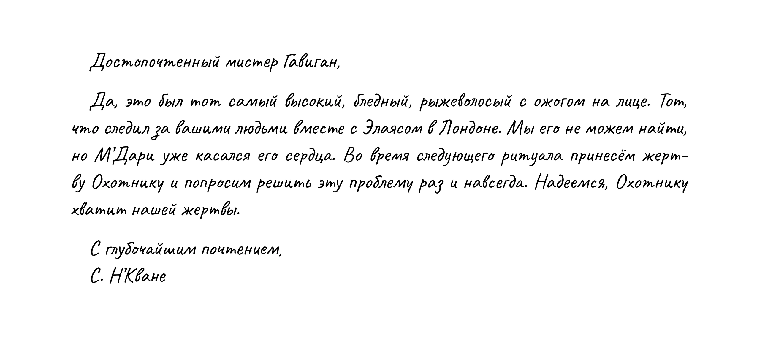 Роджер вкидывает всякого себе со стола. Там книжка арабская. Смрад от страниц как гнилое дыхание. И пара писем. И выбегает из комнаты. убивает на лестнице культиста